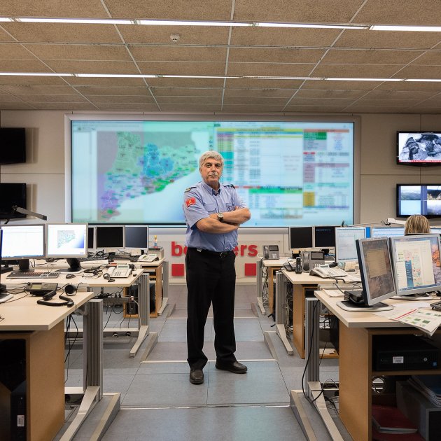 Las guardias del jefe de sala son de 24 horas, una vez a la semana. El resto de los días se trabaja en la región asignada. Cada región de emergencias, hay 7, moviliza los recursos de su territorio. Y la sala de mando moviliza los medios aéreos y los grupos de rescate, los de montaña, los subacuáticos y los GEM (los especialistas médicos), la unidad canina y todos los operativos de la Vall d'Aran. En Cerdanyola también está el Centro de Control de los Bomberos, el CCB, y Charlie-0 es quien decide si se moviliza y a qué incendio va, en caso de que haya más de uno.