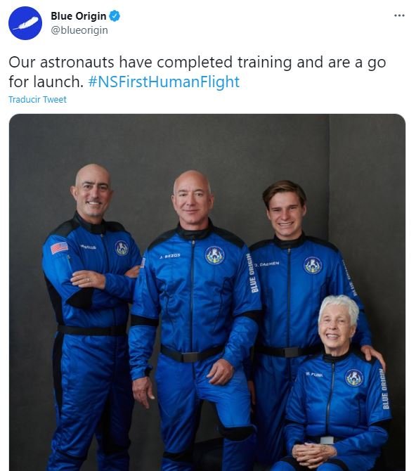 Viaja con su hermano, Mark Bezos, la pionera en aviación de 82 años Wally Funk y el joven millonario Oliver Daemen, que se convertirá en la persona más joven al llegar al espacio. "Después de quince vuelos de New Shepard, estamos preparados", afirmó el director ejecutivo de la empresa, Bob Smith.