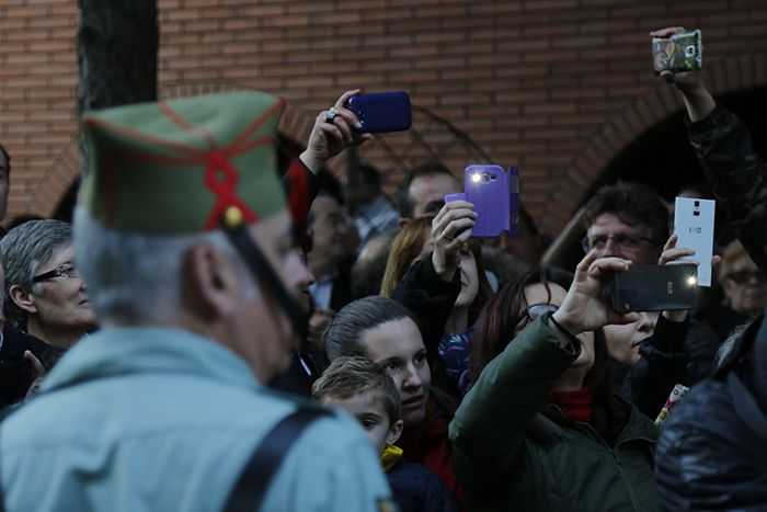 Muchos de los asistentes a la procesión han seguido el acto con el brazo alzado y aguantando el móvil. Hacían fotos y grababan la salida del Cristo de la Buena Muerte y no se perdían detalle de los pasos de los exlegionarios que escoltaban la imagen llevada por 5 de ellos.