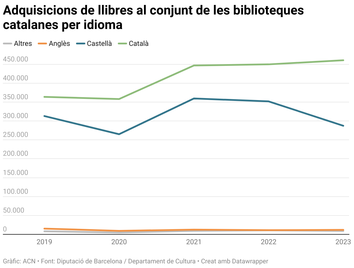 De acuerdo con la Federación de Gremios de Editores de España, el castellano fue el idioma del 70,6% de los libros que se editaron en Catalunya en 2023, mientras que solo el 24,5% de los volúmenes fueron en catalán. El esfuerzo que, según la Generalitat, se hace para conseguir que la presencia del catalán en las repisas de las bibliotecas esté "por encima" de su peso dentro del mercado editorial tiene su reflejo en los datos de adquisiciones: en el 2023 las bibliotecas catalanas compraron cerca de 770.000 ejemplares, casi el 60% de los cuales escritos en catalán; un 37,4% en castellano; y el pequeño porcentaje restante, en otras lenguas, principalmente el inglés.