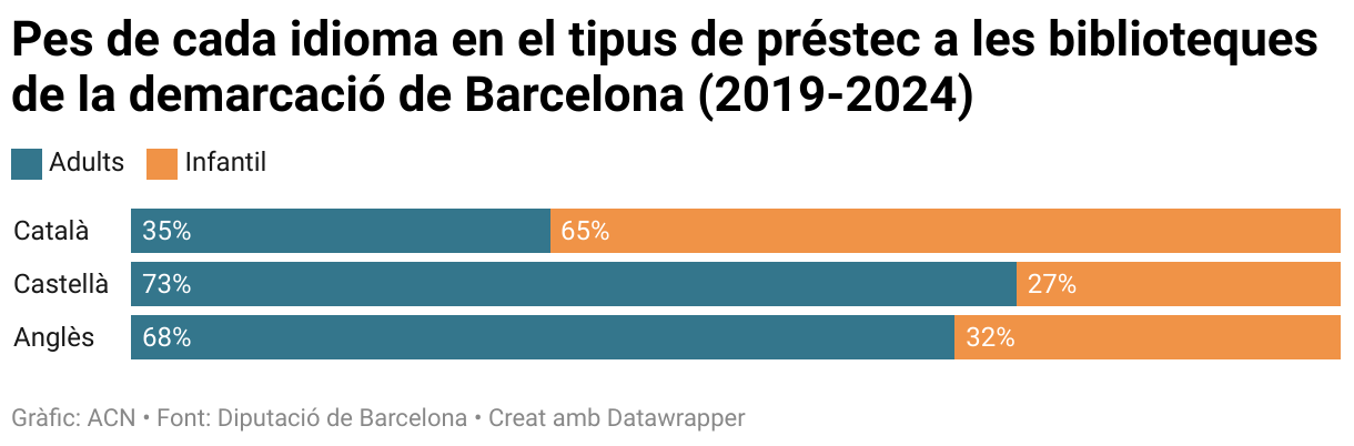 Catalán y castellano estarían muy lejos en favor de este último si no fuera por el peso específico del libro infantil en catalán en el conjunto del préstamo bibliotecario. El infantil y juvenil en catalán constituye casi un tercio de todo lo que se ha prestado a las bibliotecas municipales de la demarcación de Barcelona entre 2019 y 2024, en cualquier idioma. Y el 60% del total de libros en catalán que se prestan en el conjunto de las bibliotecas catalanas. En cambio, libros para adultos (ficción y no ficción) se presta tan solo en torno a un 16% en catalán.