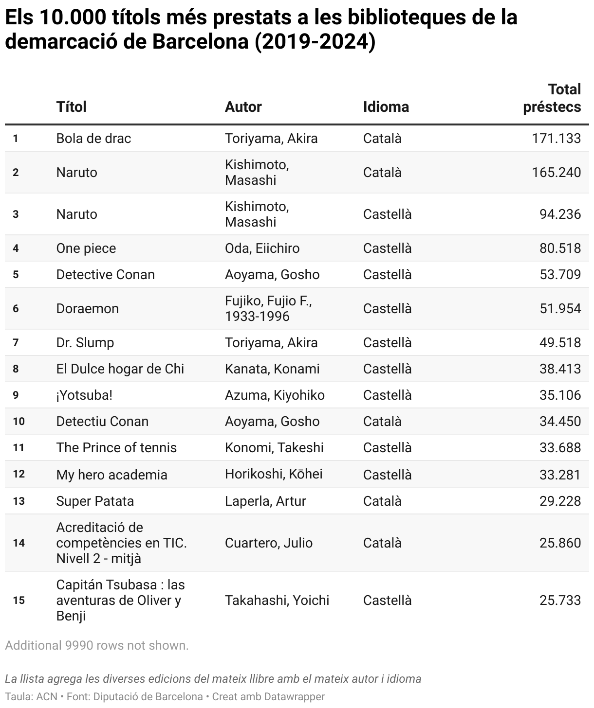 Los libros más prestados y adquiridos los últimos años están, tanto en las bibliotecas del área de Barcelona como en las del resto de demarcaciones, los de manga. En la red de bibliotecas de Barcelona, el más prestado pasado fue 'Naruto', y en las bibliotecas de las otras tres demarcaciones -con datos de 2023-, el ranking de más prestados es 'One Piece', 'Dragon Ball', 'My Hero Academia' y 'Naruto'. Con respecto a las adquisiciones, por título, en Barcelona el más adquirido fue, también, 'Naruto'. En las bibliotecas de Girona, Tarragona y Lleida, los más adquiridos del 2023 son 'One Piece' (Eiichiro Oda), en castellano, y otros manga.