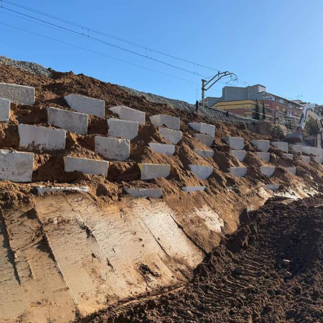 Foto principal: parte del terraplén estabilizado en unas obras de soterramiento de la línea R4 en Sant Feliu de Llobregat