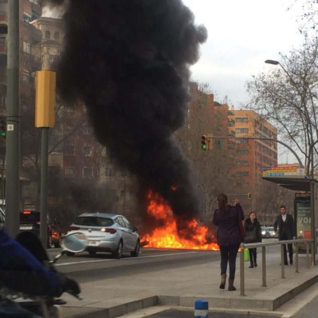 A las 8:15 horas, un grupo de encapuchados han quemado contenedores en la plaza Universitat, lo que ha provocado un corte en ambos sentidos de la marcha. Un cuarto de hora más tarde, se ha producido una escena parecida en Gran Via número 228 con una quema de neumáticos que ha levantado una columna de humo negra, visible a centenares de metros de distancia.