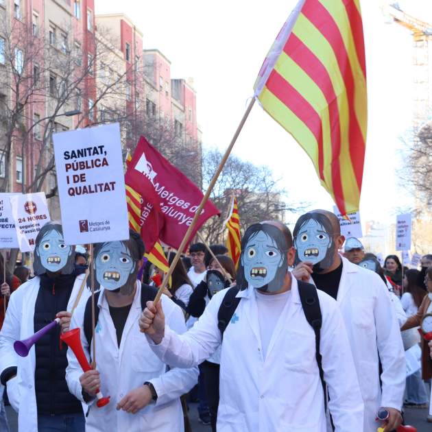 Continúan las reivindicaciones de los profesionales sanitarios en Catalunya, que reclaman desde hace meses (y años) mejoras en sus condiciones laborales para poder atender mejor a la ciudadanía. La semana comenzó con una jornada de huelga que se ha repetido este viernes, con una manifestación incluida en las calles de Barcelona. A pesar de que los días de Carnaval ya han llegado a su fin y este viernes es el primero de Cuaresma, los médicos han protagonizado un desfile reivindicativo bajo el nombre de "Carnaval de los Privilegios", con inicio y final ante la Conselleria de Salut, en la Travessera de les Corts, muy cerca del Camp Nou. Buena parte de los profesionales sanitarios iban vestidos con sus batas blancas y máscaras de zombis para representar su cansancio. De hecho, una de las grandes peticiones de los médicos, no solo en Catalunya sino también en todo el Estado, es acabar con las guardias de 24 horas, un hecho que desde el Ministerio de Salud han prácticamente descartado. Durante el recorrido de la manifestación, los médicos también han cortado la avenida Diagonal de la ciudad.