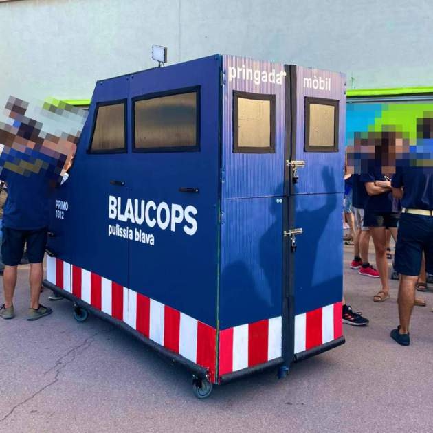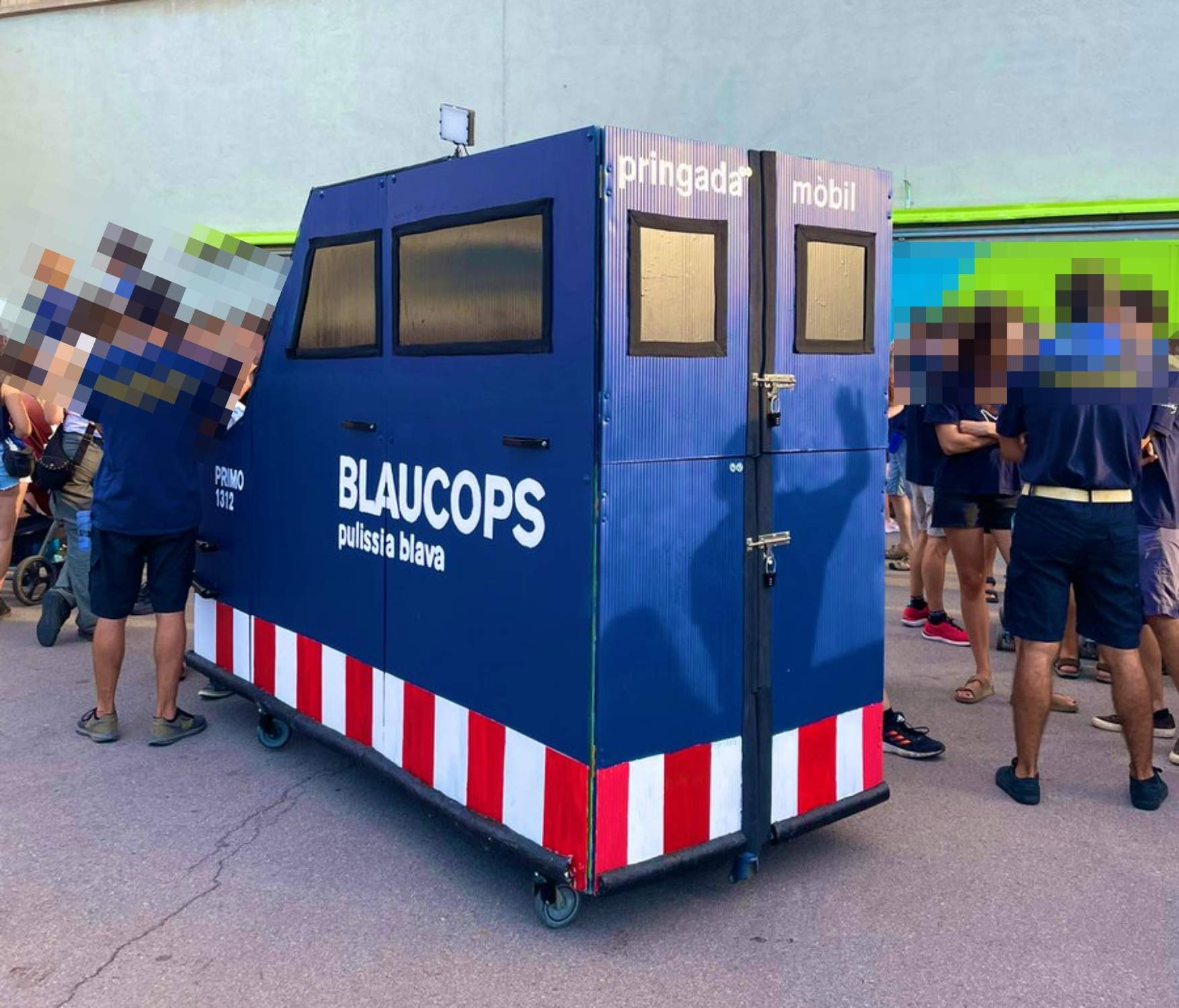 Este martes, los Blaus habían organizado una de estas actividades, incluidas en el programa oficial de la Fiesta Mayor de este municipio donde el PSC gobierna con mayoría absoluta, que, con tono de humor, enseñaba “técnicas aplicadas a la guerrilla urbana”. Entre otras cosas, se simulaba el lanzamiento de un cóctel Molotov, un artefacto incendiario de fabricación casera, contra agentes de la policía de pega. En la plaza de Can Trullàs también se había colgado un cartel explicando qué es un cóctel Molotov y cómo debía usarse como una “técnica-táctica en la estrategia subversiva”. Todos los que pasaban por esta actividad organizada por Blaucops —una colla dentro de la colla de los Blaus, que hace bromas sobre la policía y que organiza también una fiesta donde una furgoneta de la Brigada Mòbil (Brimo) de cartón sirve de carroza— podía lanzar cócteles Molotov de papel contra un policía falso.