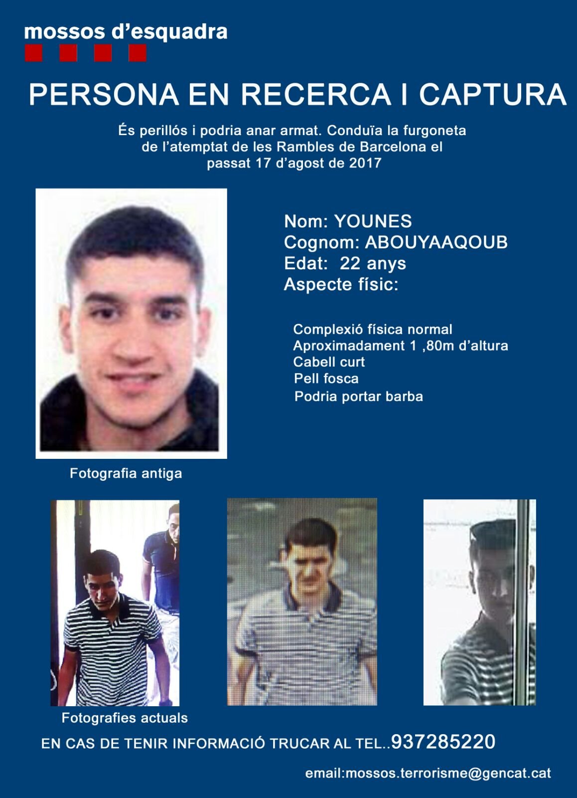 Los Mossos D'Esquadra ha difundido la fotografía de Younes Abouyaaqoub, considerado el conductor de la furgoneta que hizo el atropello en la Rambla. Los Mossos han hecho llegar la fotografía a todas las policías y ahora también la difunden entre la población para encontrar al terrorista con la colaboración ciudadana.