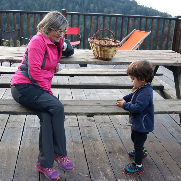 Fotografía de portada: una abuela y su nieto disfrutan de las instalaciones de una casa rural del Berguedà.