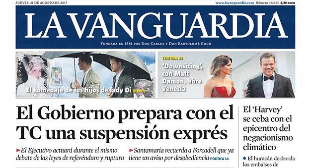 La portada del día este jueves no es esta, pero por poco. La de La Vanguardia es aparentemente inofensiva pero es realmente demoledora. Quizás queriendo hacer aparecer al gobierno español trabajando con energía y planes precisos para impedir el referéndum del 1-O, el diario titula su primera de papel así: "El gobierno prepara con el TC una suspensión exprés". Caramba. Tal vez le ha salido el tiro por la culata, pues parece presentar como normal que el poder ejecutivo compadree con el guardián de la Constitución y tribunal de último recurso sobre los derechos y libertades de los ciudadanos.