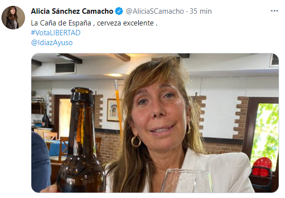 En una publicación en su perfil de Twitter, Camacho ha escrito "La caña de España, cerveza excelente". Y ha acompañado el mensaje con el hashtag "Vota Libertad", haciendo referencia al lema repetido por la candidata.