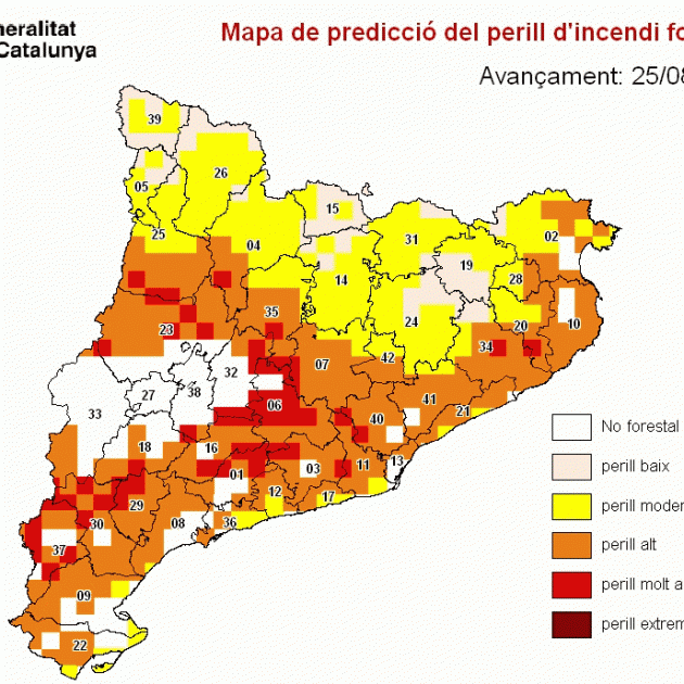 El plan INFOCAT está en prealerta ante el elevado riesgo de incendio forestal en 21 comarcas de todas las demarcaciones. La situación se puede alargar los próximos días ante la subida de temperaturas máximas y las humedades relativas mínimas bajas en varias zonas del territorio.