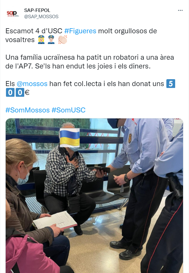 Ante esta injusta situación, que coincide con un momento muy duro para la familia, lejos de su tierra y sin saber dónde acabará su viaje, los Mossos decidieron ponerse manos a la obra y empezaron a recoger dinero que no podrá sustituir las joyas y los objetos de valor que han perdido, pero les puede ayudar en un momento tan difícil. Concretamente, han conseguido juntar unos 500 euros que ya han entregado a la familia. Así lo ha compartido el sindicato mayoritario de los Mossos SAP-FEPOL en una imagen en las redes sociales con una imagen junto con los miembros de la familia.