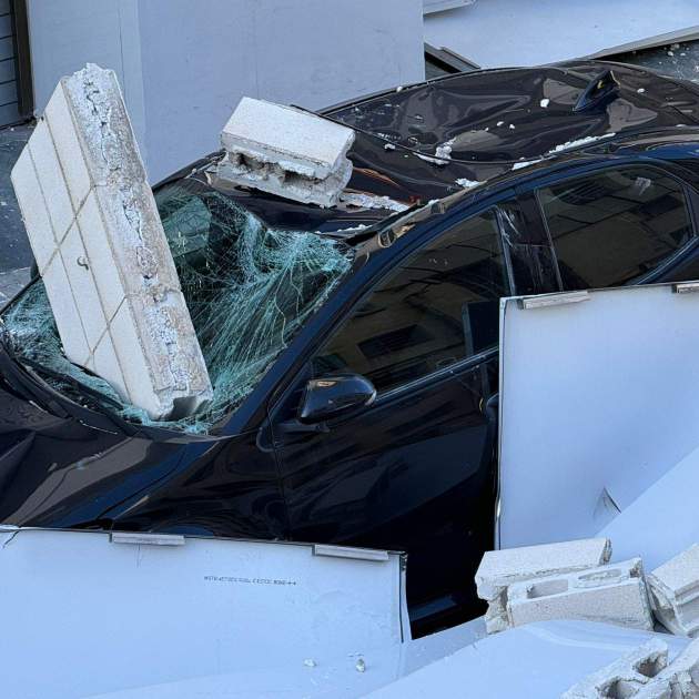 Susto de los grandes a primera hora de la mañana en l'Hospitalet de Llobregat, en la Travessia Industrial. El desprendimiento de un muro de un taller mecánico ha hecho caer, sobre un coche, una pieza de hormigón, en pleno temporal de viento. En el interior del vehículo, esperando en el asiento del conductor, había una mujer, que se ha salvado por pocos centímetros. Ha vuelto a nacer. Los Bombers la han retirado, herida leve, con un ataque de ansiedad y una contusión, y ha podido ser trasladada por el Sistema d’Emergències Mèdiques (SEM). Si hubiera estado en el asiento del copiloto, habría sufrido mucho más daño. Los cuerpos de emergencias trabajan para sanear la zona y poder abrir el tráfico. Es uno de los incidentes más relevantes en la zona de l'Hospitalet de Llobregat, aunque también se han registrado más, con caídas de árboles y muros.