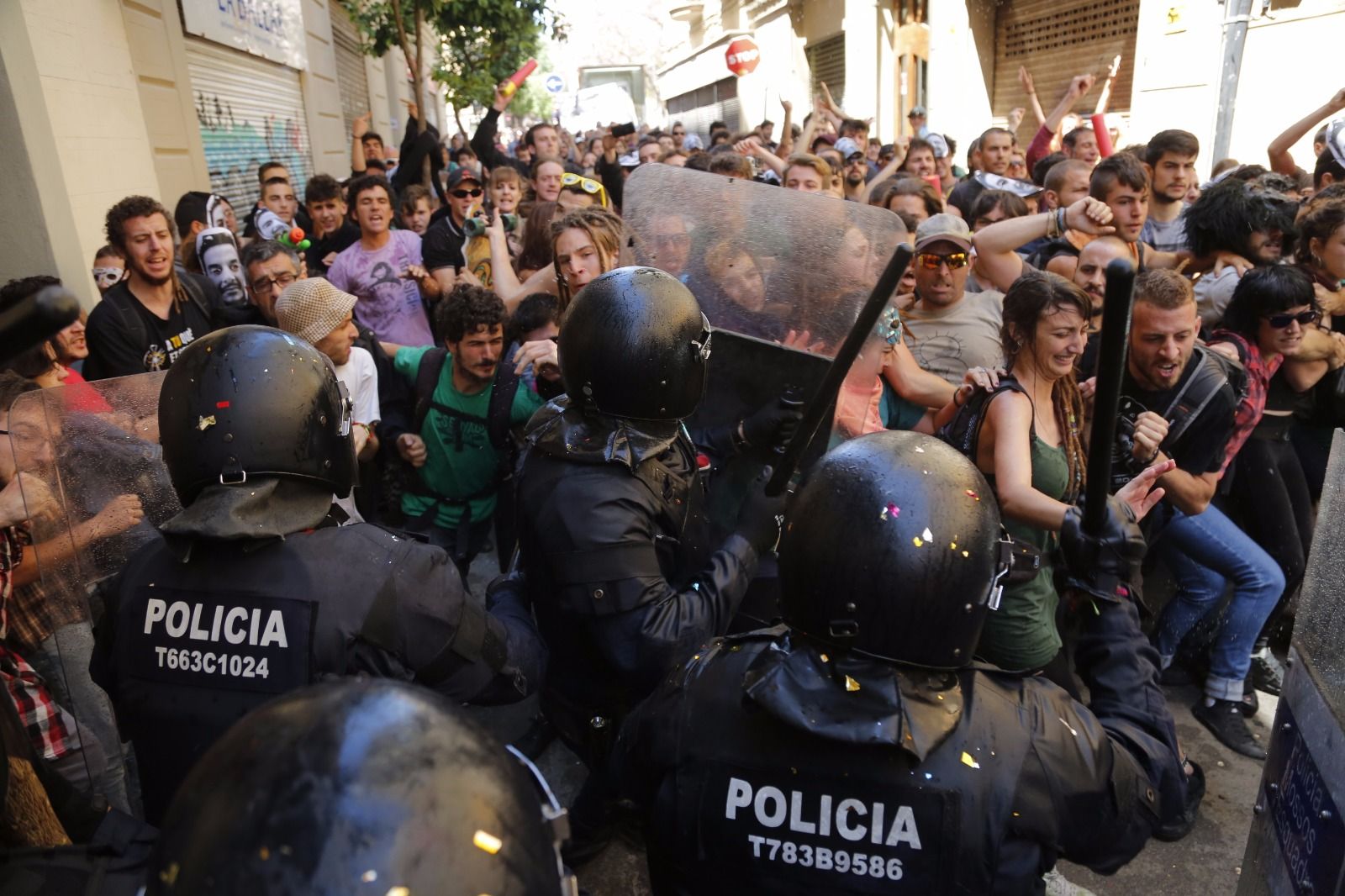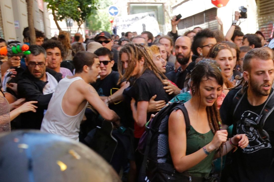 Los Mossos d'Esquadra, a punto de cargar en la calle Puigmartí de Gràcia contra la línea de manifestantes por el desalojo del Banc Expropiat.