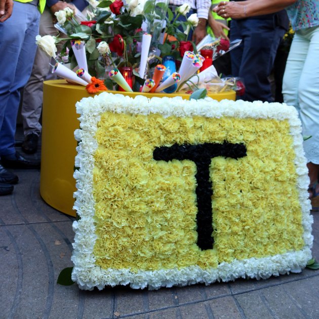 Los taxistas de Barcelona han hecho este sábado por la tarde su propio homenaje en la Rambla a las víctimas de los atentados terroristas del pasado 17-A. El homenaje se tenía que celebrar ayer por la tarde pero debido a la fuerte lluvia los taxistas decidieron aplazarlo.