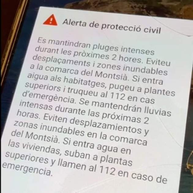 Los días de lluvias intensas en Catalunya todavía no han acabado. Protecció Civil ha enviado este miércoles una alerta a los móviles de los ciudadanos del Montsià advirtiéndoles de fuertes aguaceros en las próximas horas, por lo que les ha instado a no coger el coche o desplazarse con cualquier otro medio para evitar que se produzcan incidencias. “Evitad cruzar ríos, arroyos y barrancos”, han dicho en la red social X antes de comunicar que, en caso de que entre agua en las viviendas, “subid a plantas superiores y llamad al 112”. Ante la emergencia, el president de la Generalitat, Salvador Illa, se ha sumado a la llamada de Protecció Civil. “Pido máxima precaución en la comarca del Montsià, donde se está produciendo un episodio de lluvias intensas”, ha comunicado a los catalanes