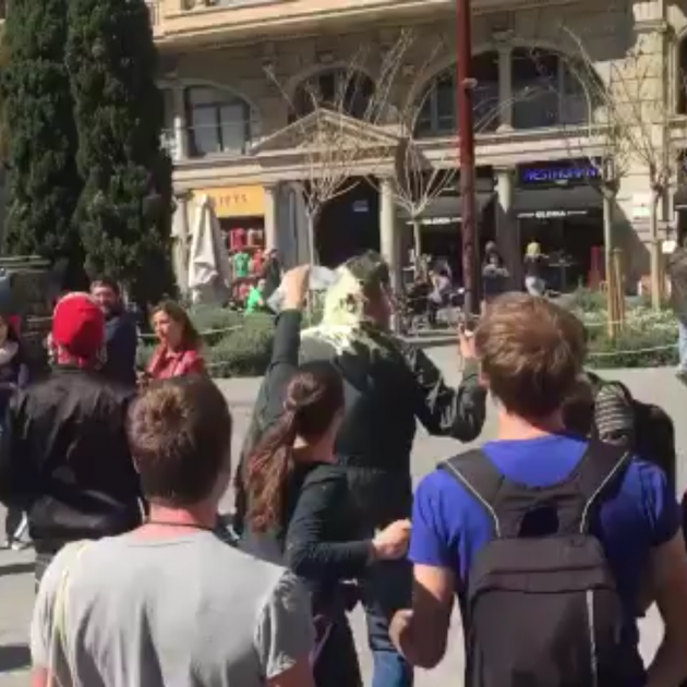 Entonces la tensión se ha producido entre los manifestantes, cada vez más numerosos, y la policía. Ha habido algún forcejeo y bastantes gritos. Hacia las dos del mediodía, los Mossos han sacado rápidamente el hombre con un casco de moto en la cabeza y lo han puesto dentro de un coche patrulla. Eso ha generado carrerillas, gritos, lanzamiento de huevos de pintura al coche policial y algún empujón entre agentes y manifestantes.