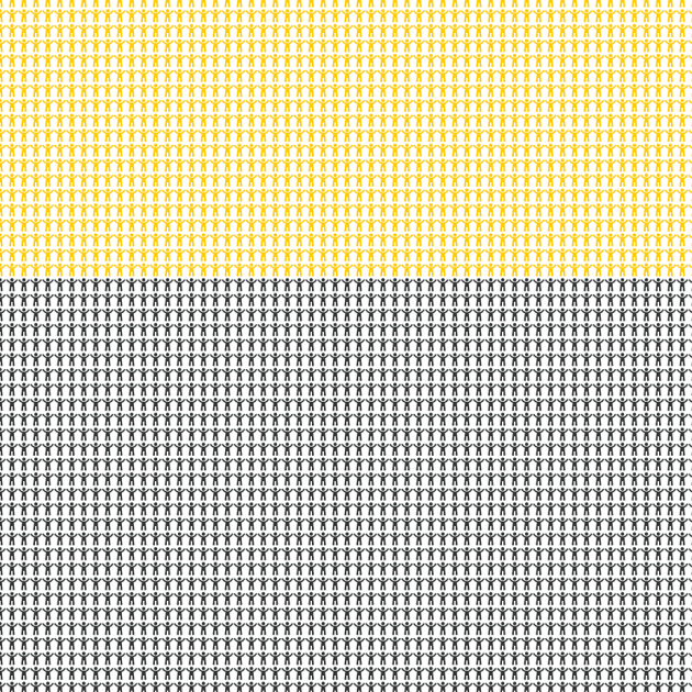 Los 7.000.000.000 de iconos –suponiendo que estén todos, que no los hemos contado– representan los habitantes de la Tierra, separados en colores por continentes: amarillo por Asia, negro por África, rojo por América, azul por Europa y verde por Oceanía, los mismos colores que los aros olímpicos.