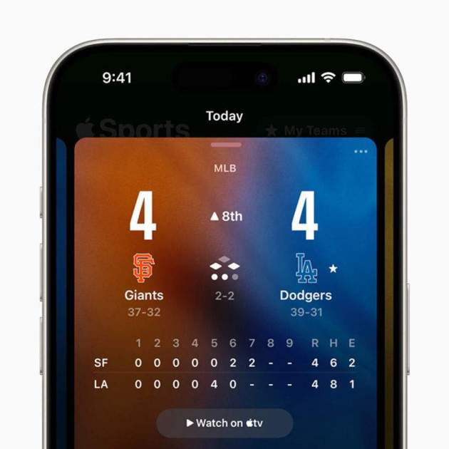 Los usuarios pueden personalizar sus marcadores en Apple Sports siguiendo sus equipos, torneos y ligas favoritos. Los fans pueden navegar fácilmente entre los resultados y los próximos partidos; explorar la información jugada por jugada, las estadísticas del equipo, los detalles de las alineaciones y las probabilidades de apuestas en vivo; y tocar para ir a la aplicación Apple TV para ver los partidos en vivo de Apple y aplicaciones de retransmisión conectadas.