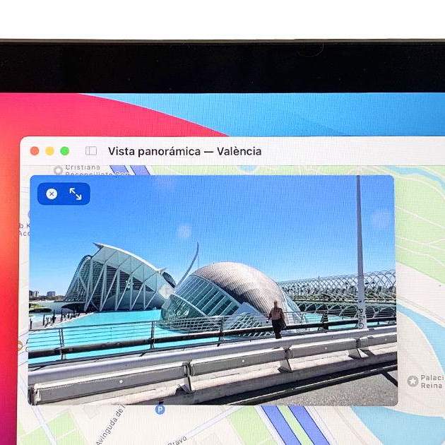 Adicionalmente, también es posible ampliar la vista panorámica de Look Around haciendo zoom –separando con dos dedos sobre la imagen– y por supuesto ampliar la ventana a pantalla completa presionando sobre el botón con un icono de dos flechas situado en la esquina superior derecha de la ventana flotante.