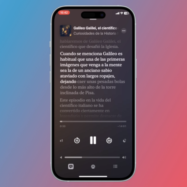 El funcionamiento de esta prestación de Apple en el iPhone y en el iPad es realmente sencillo. El texto de la transcripción de podcasts se genera automáticamente, se sincroniza en tiempo real y destaca el texto que está reproduciendo el audio en esos momentos, tal y como sucede con el karaoke en Apple Music Sing.
