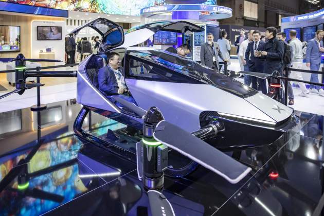 Un hombre sentado en el coche volador fabricado a China y presentado por XPeng. El vehículo permite un vuelo de 30 minutos y llega a velocidades hasta 130 km/h.