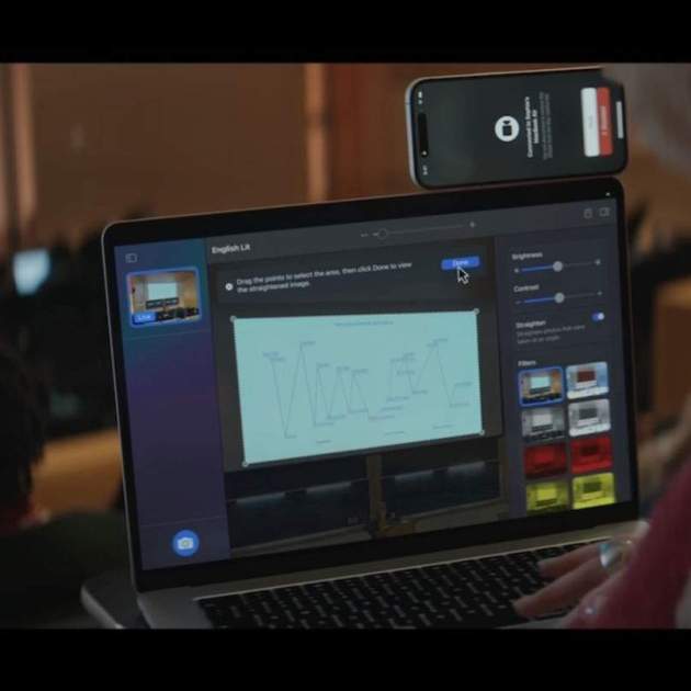 En el vídeo dedicado al Mac se muestra la función Lupa que llegará próximamente y con lujo de detalles. Una mujer utiliza un iPhone conectado al Mac para ampliar la pizarra del aula y ver mejor los contenidos expuestos por el profesor. Esto será posible gracias al zoom de la cámara de iPhone que a su vez se conectará mediante la función de Cámara de Continuidad al Mac.