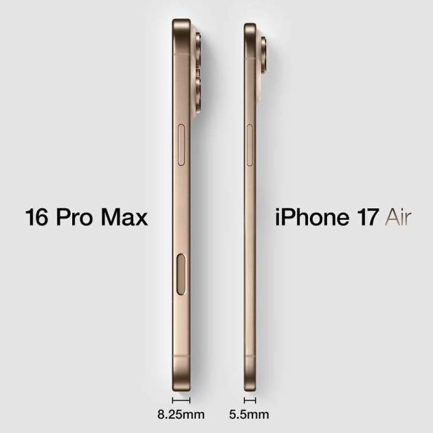 Según las filtraciones publicada en Weibo por el conocido informante Ice Universe, el iPhone 17 Air y el iPhone 17 Pro Max compartirían la misma longitud, anchura, tamaño de pantalla y biseles. La única diferencia notable radicaría en el grosor de los dispositivos. "Mientras que el iPhone 17 Air presumiría de un perfil ultrafino de 5,5 mm, el iPhone 17 Pro Max alcanzaría los 8,725 mm."