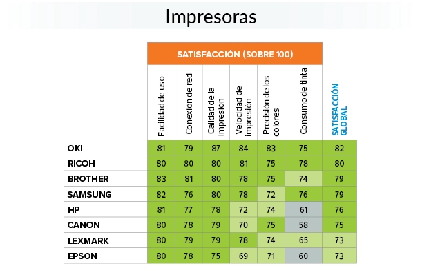En el estudio, las marcas protagonistas son ocho: Oki, Ricoh, Brother, Samsung, HP, Canon, Lexmark y Epson. Se pregunta por siete cuestiones que no son otras que la facilidad de uso, la capacidad de conectarse a la red, la calidad de impresión, la velocidad, la precisión de los colores, el consumo de tinta y la satisfacción global. Oki es la mejor valorada en calidad de impresión (87), velocidad (84), precisión de colores (83) y satisfacción global (82). En las tres categorías donde Oki no es la marca más valorada; los primeros puestos los ocupan Brother, que gana con un 83 en facilidad de uso y con un 81 en capacidad de conexión a la red, y Ricoh, que con un 78 es la mejor puntuada si nos referimos al consumo de tinta.