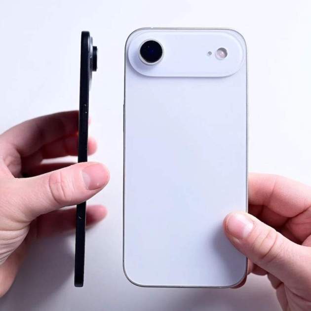 El iPhone 17 Air tendría un grosor aproximado de 5,5 mm, el más delgado en cuanto a la gama de iPhone en su historia. Parte de que este modelo sea así se debe a que Apple ha prescindido de algunos elementos característicos, quizá el más notable de forma física sea tener una lente en lugar de dos. Su grosor podría comprometer la duración de la batería, en este caso se dice que la duración de batería podría ser de alrededor 2.800 mAh.