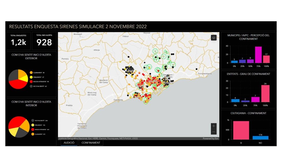 Durante el último simulacro de confinamiento que Protecció Civil desarrolló en la provincia de Tarragona a principios del pasado mes de noviembre planteando como situación un accidente químico, la Generalitat realizó mediante la herramienta ArcGIS Survey123 un total de 1.200 encuestas en tiempo real que permitieron recoger información sobre el funcionamiento de las 100 sirenas que Protecció Civil tiene repartidas por los cinco municipios (Tarragona, la Canonja, Vila-Seca, Salou y Reus) situados en el entorno inmediato de los polígonos petroquímicos de la provincia. Igualmente, se pudo recoger información sobre los avisos recibidos el móvil por la ciudadanía durante el simulacro. Con los datos, la Generalitat espera optimizar el proceso de toma de decisiones de los equipos implicados en la seguridad ciudadana.