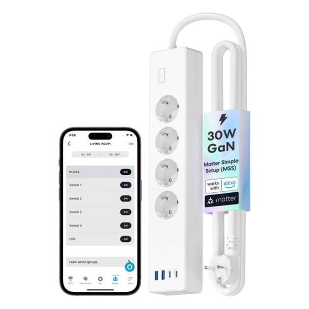Recuerda que, además de estas regletas inteligentes, también tienes a tu disposición enchufes individuales para controlar otros aparatos desde la pantalla de tu móvil. Pero fíjate bien que sean compatibles con tu plataforma. En este caso, la regleta viene en tres versiones con soporte para HomeKit, Matter (funciona con iPhone), Alexa y Google.
