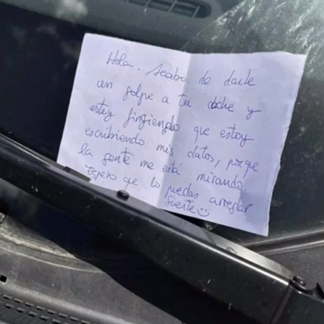 Un conductor ha indignado a muchos usuarios de las redes sociales por la siguiente nota: "Acabo de darle un golpe a tu coche y estoy fingiendo que estoy escribiendo mis datos porque la gente me está mirando. Espero que lo puedas arreglar. Suerte", escribió en un papel tras darle un colpe al coche aparcado.