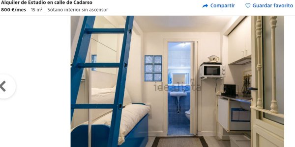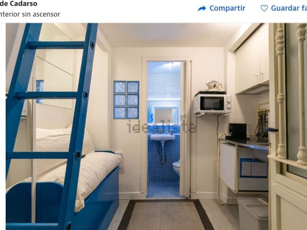 El último piso publicado por El Zulista aún está activo cuando se escribe este artículo. Es un estudio en la calle Cadarso, en el madrileño barrio de Argüelles, y lo más grave es que, pese a contar solo con 15 metros cuadrados, vale 800 euros. Lo anuncia la inmobiliaria Home About. A 53,3 euros el metro cuadrado, casi triplica el precio medio de la capital. No es el piso más apretado que encontramos porque cuenta con un altillo donde dormir, pero la ventilación es prácticamente nula. Un pequeño patio interior donde tampoco se aprecia una gran iluminación podría ser un respiro.