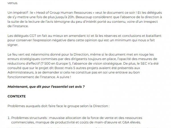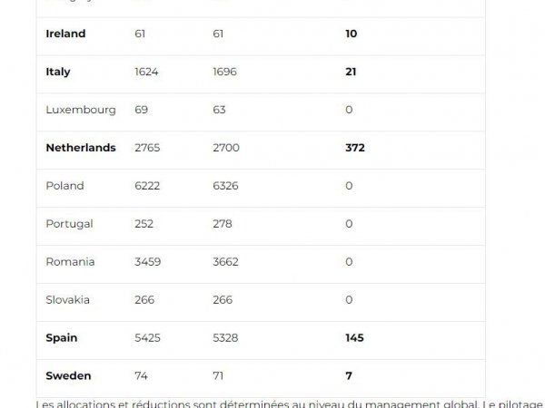 Según un documento del comité europeo al cual ha tenido acceso ON ECONOMIA a través de la CGT francesa y validado por una fuente sindical en España, la empresa habría presentado un plan de reestructuración que afectaría a 7.500 trabajadores en el peor de los casos. En España, la reducción de personal, de 145 personas en dos años, les permitiría impedir el ERE, y es de hecho una cifra inferior a los despidos producidos en los últimos años. El mismo documento muestra como la evolución de la plantilla en España ha hecho que se pase de los 5.425 trabajadores en 2021 en los 5328 actualmente. Los 145 despidos representan el 2,7% de la plantilla de 5.328.