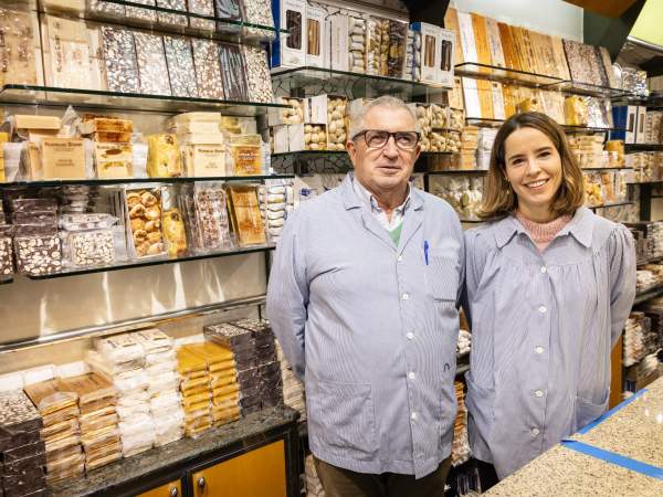 Josep Planelles Donat –quinta generación del primer apellido y cuarta del segundo– y su hija Laia Planelles Torrent –sexta generación–, que aparecen en la fotografía superior, relatan que sus antepasados jijonencos comenzaron la venta ambulante de turrones en Barcelona en 1850, en el mercado de productos navideños que se montaba en la plaza Reial. Y en 1870, los Planelles ya se instalaron en la escalera del número 9 de la plaza Cucurulla, donde aún continúan.