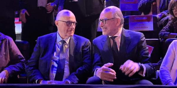 Foment del Treball ha premiado este martes a Josep Oliu, presidente de Banco Sabadell, con la medalla de honor al empresario del año después de impedir la opa hostil del BBVA. Las otras dos medallas de honor otorgadas por esta patronal catalana han sido para Pedro Fontana (premio a la trayectoria profesional), vicepresidente de Banco Sabadell y presidente de Areas, y para el exprimer ministro italiano Enrico Letta (premio a la contribución al proyecto europeo). En la imagen superior, Oliu y Fontana en el acto de Foment celebrado en el Teatre Nacional de Catalunya.
