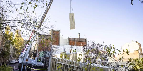 Montar una casa en medio de Barcelona puede ser cuestión de días. De siete, concretamente. Es lo que tarda la empresa catalana Arquima, con fábrica en Abrera, en hacer una casa industrial de tres plantas y terraza con un total de 460 metros cuadrados en el barrio de Poble-Sec. Ellos se ocupan de la estructura de madera ligera, hecha de abeto de Austria y pino de Teruel, pero los cimientos han tardado también siete días en estar listos. La parte más larga del proceso serán los acabados, que tardarán cinco meses en hacerse antes de que se puedan entregar las llaves al propietario.